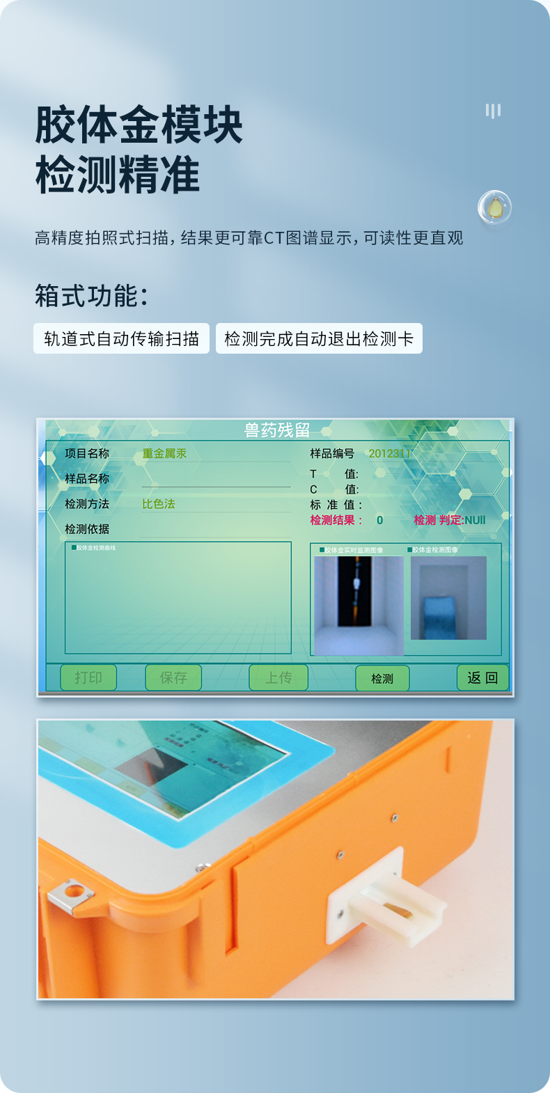 7、膠體金模塊檢測方式:軌道式自動傳輸掃描,檢測完成后自動退出檢測卡。