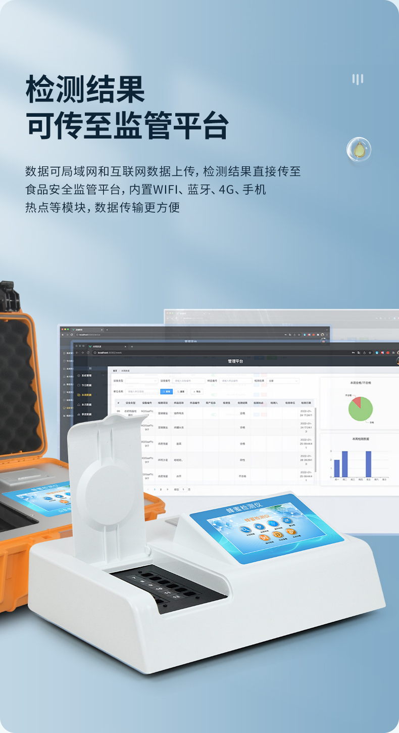 4、儀器帶有監管平臺,數據可局域網和互聯網數據上傳,檢測結果直接傳至食品安全監管平臺。進行區域食品安全監管及大數據分析處理與數據統計,檢測區域食品安全長短期動態,達到食品安全問題預估、預警