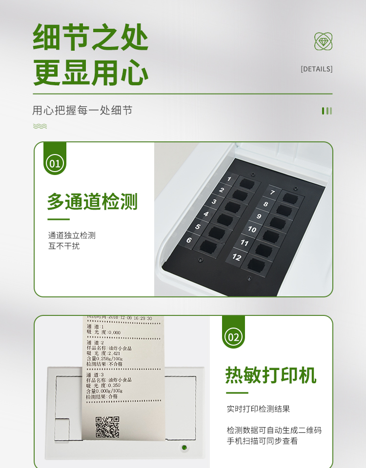 5、配備新一代嵌入式熱敏打印機,可選擇手動打印或者自動打印,檢測完成可自動打印檢測報告和二維碼。
